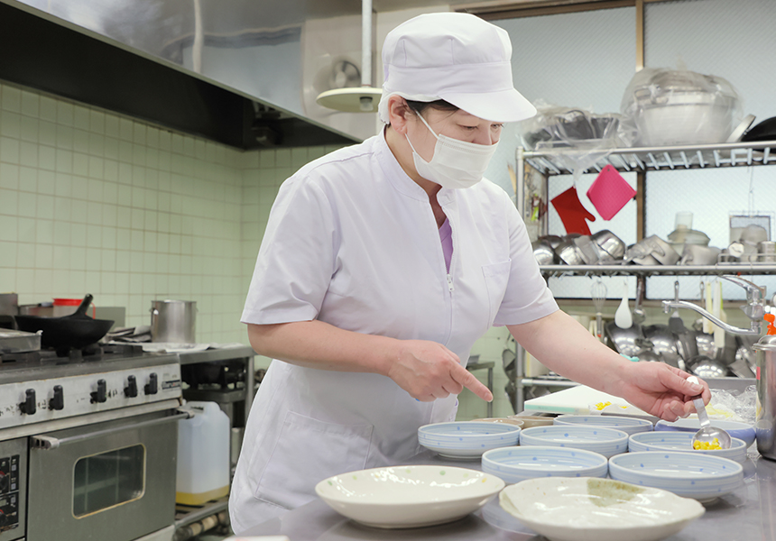 入院患者さまの病態や嗜好、嚥下状態に合わせた栄養管理、栄養指導、給食管理を行っています。清潔な厨房において調理のうえ、温冷配膳車を用い温かい料理は温かく、冷たい料理は冷たい状態でお食事をお届けしています。